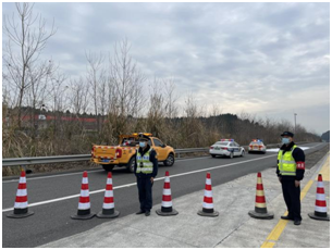 演練模擬成萬方向K110+500處因冰雪天氣影響,路面出現(xiàn)積雪結(jié)冰,導致車輛行駛中打滑側(cè)溜迫停,造成交通路塞。參演單位按照演練方案快速集結(jié),迅速組織人員裝備,趕赴事發(fā)地點,有序?qū)嵤┙煌ü苤疲O置交安設施,實施緊急救援,清理路面障礙,疏散滯留車輛,消除安全隱患,恢復車輛通行。