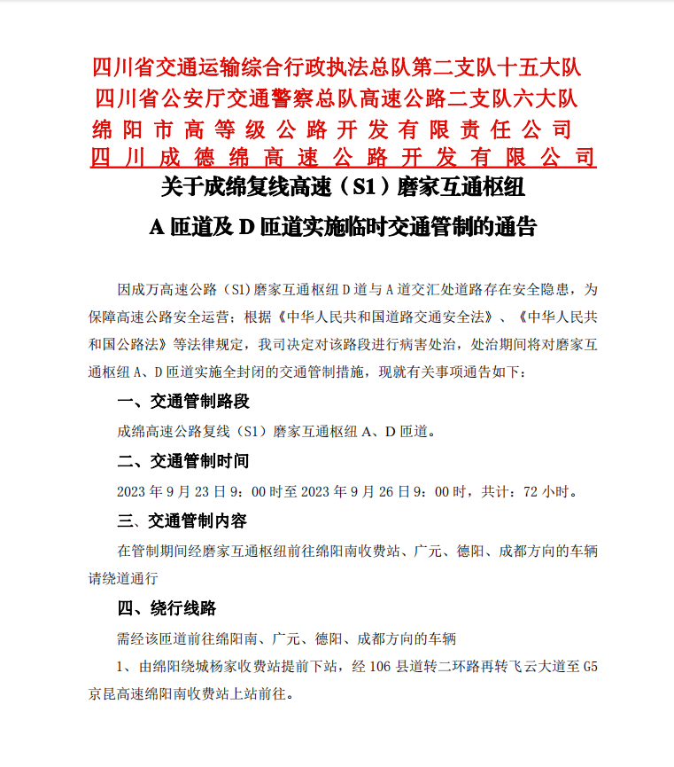 關(guān)于成綿復(fù)線高速(S1)磨家互通樞紐A匝道及D匝道實(shí)施臨時(shí)交通管制的通告