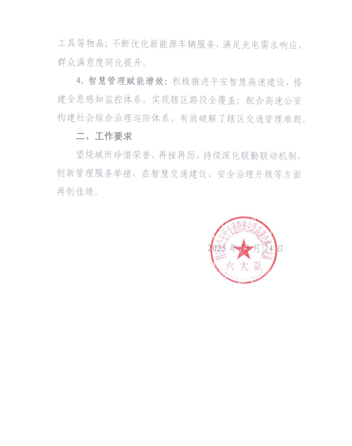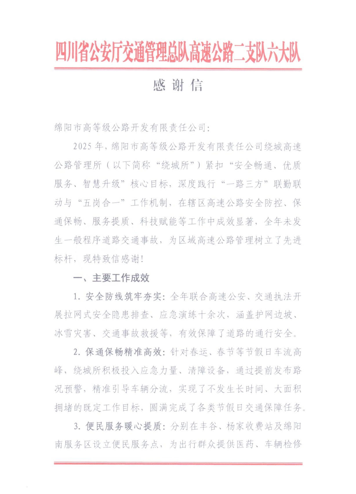 1月15日高開司收到來自四川省公安廳交通管理總隊高速公路二支隊六大隊的一封感謝信。信中對高開司繞城高速2025年度“安全暢通、優(yōu)質(zhì)服務(wù)、智慧升級”核心目標(biāo),深度踐行“一路三方”聯(lián)勤聯(lián)動與“五崗合一”工作機(jī)制,在轄區(qū)高速公路安全防控、保通保暢、服務(wù)提質(zhì)、科技賦能等工作中成效顯著,全年未發(fā)生一般程序道路交通事故,為區(qū)域高速公路管理樹立了先進(jìn)標(biāo)桿,給予高度贊譽(yù),對公司與高速公安攜手筑牢道路安全防線、全力保障公眾出行順暢的堅實舉措表達(dá)誠摯謝意,字里行間滿含認(rèn)可與期許。